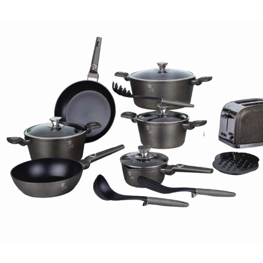 - A készlet kovácsolt alumíniumból készült, amelyet 3x tartós tapadásmentes titán bevonattal láttak el. Ez a kombináció biztosítja a hosszú élettartamot és a könnyű tisztíthatóságot, így az ételek nem tapadnak le, és a mosogatás is gyerekjáték.