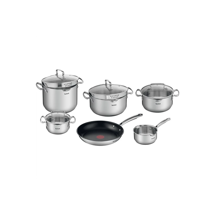 - A rozsdamentes acél edénykészlet szűrésre alkalmas fedőt, kiöntőcsőrrel ellátott lábast és különböző méretű edényeket tartalmaz a gond nélküli, cseppenésmentes kiöntés érdekében, praktikusan tervezve egy nagyobb lyukkal a tészta leszűréséhez, illetve kisebb lyukakkal a másik oldalon a rizs leszűréséhez.