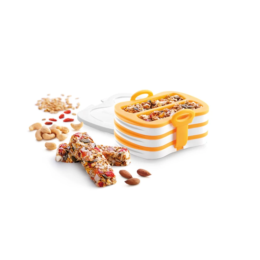 Kiváló eszköz gyümölcsök, diófélék, magvak, gabonafélék, méz stb. felhasználásával készült házi szeletek préseléséhez és sütéséhez. Praktikus tasakokkal, amelyekbe a kész szeletek csomagolhatóak. Ellenálló műanyagból és első osztályú hőálló szilikonból készült. A recepteket is tartalmazó használati útmutató a csomagolás részét képezi. 3 év garancia.