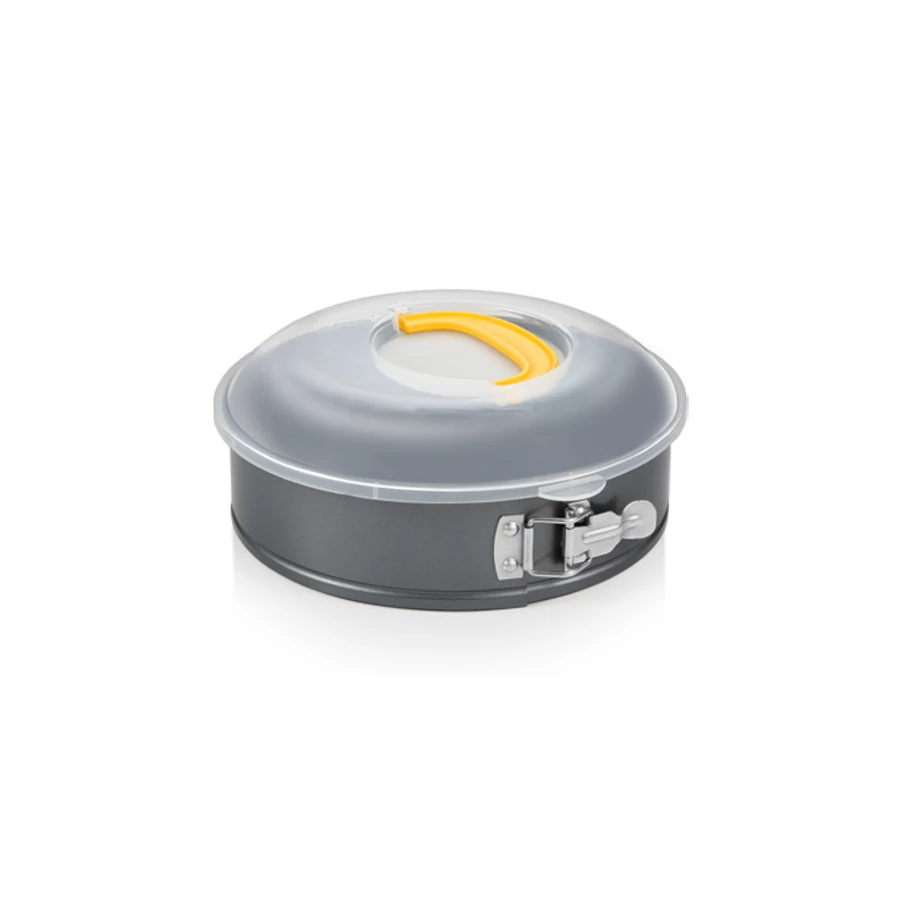Kapcsos sütőforma első osztályú tapadásmentes bevonattal az odaégés ellen, és fogantyúval ellátott védőfedéllel, a sütemények higiénikus tárolásához és szállításához. Minőségi fémből készült, a fedő ellenálló műanyagból. 3 év garancia.
