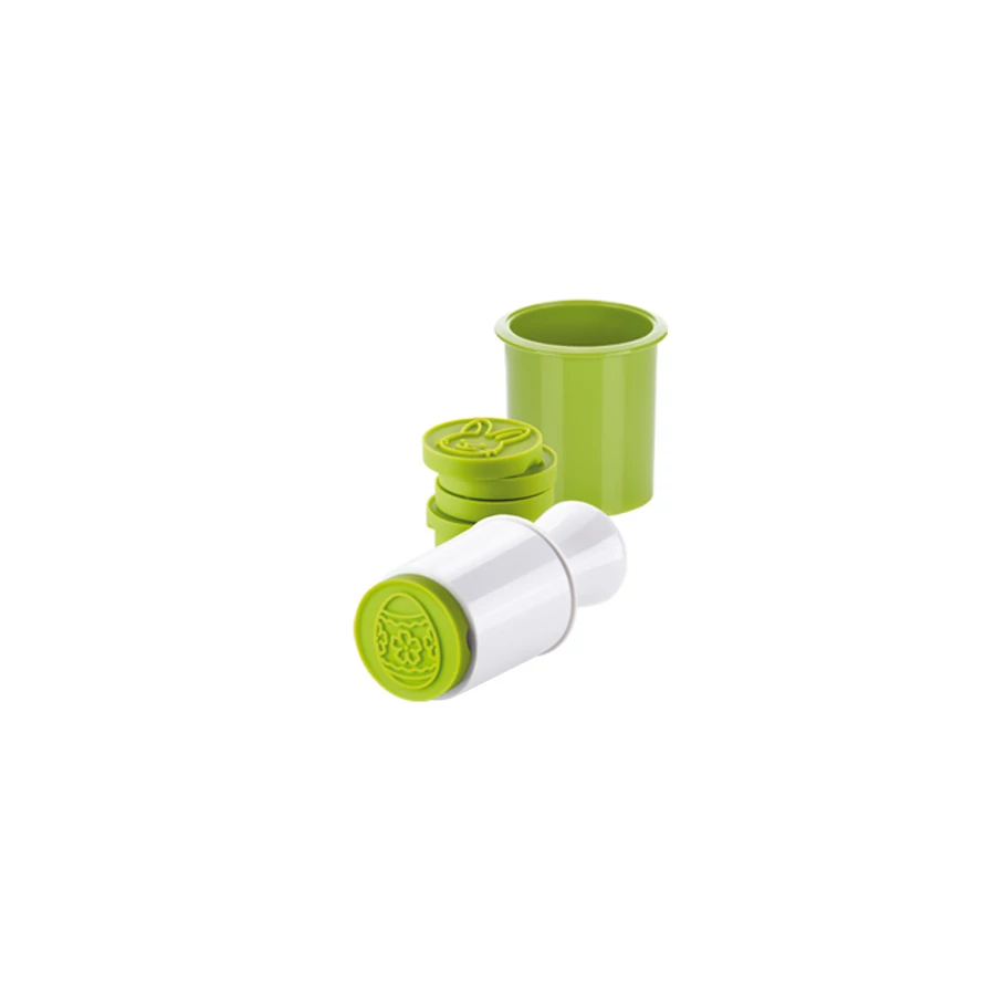 Kiválóan alkalmas díszített házi kekszek elkészítésére. A készlet pecsétet, 6 könnyen cserélhető eredeti mintát és egy kör alakú kivágót tartalmaz. A minták a pecsét tárolójában találhatóak. Első osztályú ellenálló műanyagból és szilikonból készült, mosogatógépben tisztítható. A csomagban receptek is találhatók. 3 év garancia.