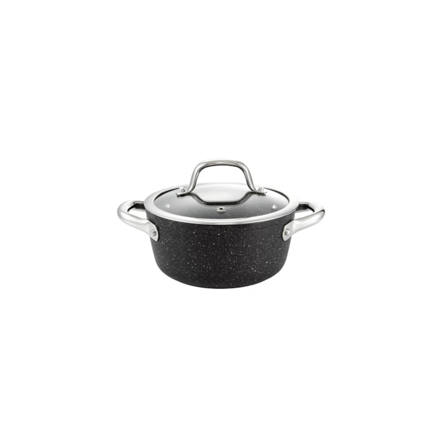 Luxus edény elsőosztályú tapadásmentes bevonattal alkalmas fém konyhai eszközökhöz is. A tapadásmentes bevonattal és belül a csiszolatlan terméskő jegyeivel ellátott edényben az étel nem ég oda, a főzés gyors és egyenletes. Masszív rozsdamentes acél üvegfedő gőznyílással, vízálló rozsdamentes acél fülek és indukciós alj. Minden típusú tűzhelyre és sütőbe alkalmas (fedővel max. 200 °C-ig). Mosogatógépbe alkalmas. 5 év garancia.