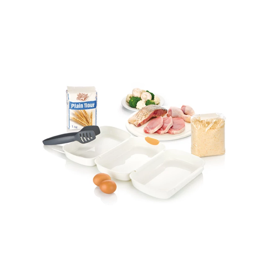 A szett segítségével könnyen és gyorsan panírozhat vagy tésztával vonhat be húst, halat, sajtot, gombát és zöldségeket. A három egymásba kapcsolható, csúszásmentes talpakkal ellátott tálka kitűnően alkalmas az ételek liszttel, felvert tojással, zsemlemorzsával történő panírozására. A hőálló nejlon csipesz segítségével panírozhat, és megforgathatja a serpenyőben sült ételeket. A szett része egy éles lapka, amellyel a tojás könnyedén feltörhető. Hűtőben, fagyasztóban, mikrohullámú sütőben használható. Mosogatógépben tisztítható. Receptek a csomagolásban. 3 év garancia.